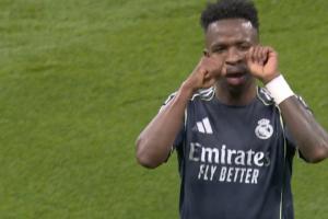 维尼修斯点射破门后做哭脸庆祝动作,扶着角旗杆摆pose。