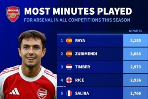 体育资讯2月25日讯 德国转会市场统计了本赛季阿森纳球员在所有赛事中的出场时间,并列出榜单。