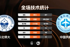 末节比赛,中国民航先拿5分缩小分差,东北师大及时调整给出回应,僵持半节之后中国民航的外线突然投开,连续命中三分球后分差仅剩3分,关键时刻闫思恺也是强投三分命中几乎杀死了中国民航逆转的希望,最终东北师大力克中国民航成功晋级。