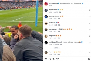 超巨失误+神扑!多纳鲁马社媒晒同球迷拥抱照:我们团结到最后一刻