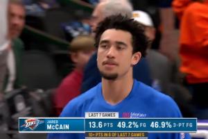 麦凯恩过去7场:场均13.6分,投篮命中率49.2%,三分命中率46.9%,6场得分上双。